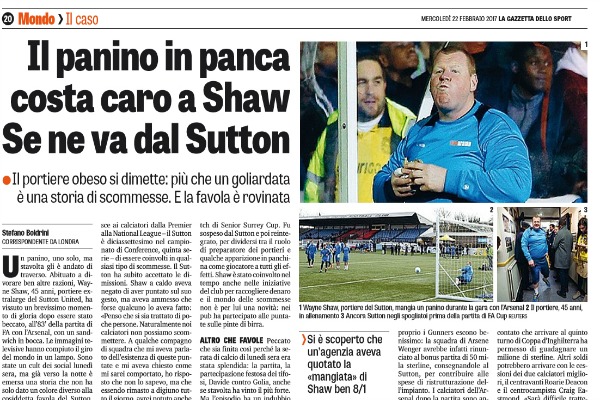 "Un panino, uno solo, ma stavolta gli è andato di traverso. Abituato a divorare ben altre razioni, Wayne Shaw, 45...