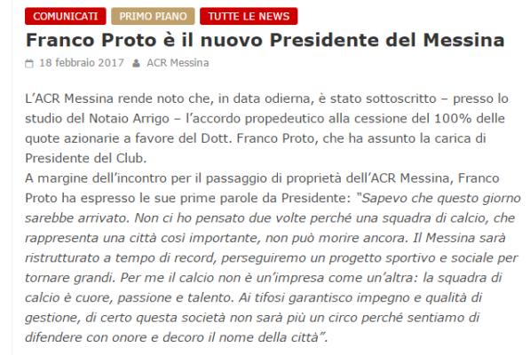 Il Messina Calcio, annuncia tramite il proprio sito ufficiale che il nuovo presidente della società è il Dottor Franco Proto, che...
