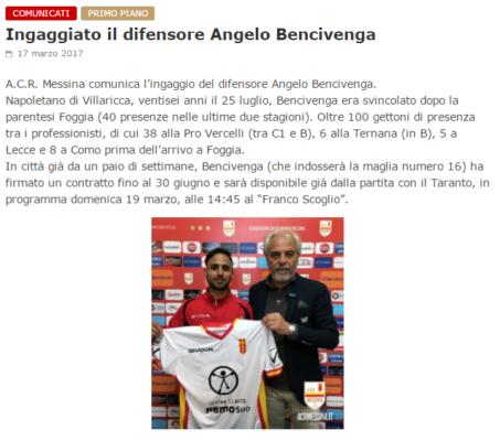 Il Messina calcio annuncia tramite il proprio sito ufficiale di aver ingaggiato il difensore Angelo Bencivegna, rimasto svincolato dopo l'ultime...