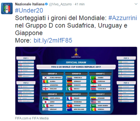 Si sono svolti i sorteggi per il Mondiale Under 20 che si terrà in Corea del Sud dal 20 maggio...