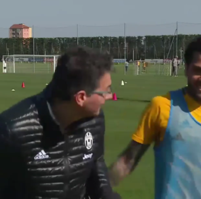 Il terzino della Juventus Dani Alves irrompe durante un collegamento della Tv telematica del club bianconero nascondendosi dietro il giornalista...
