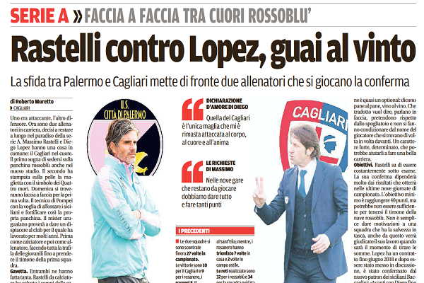 La Nuova Sardegna: “Rastelli contro Lopez, guai al vinto. La sfida tra Palermo e Cagliari mette di fronte due allenatori che si giocano la conferma”