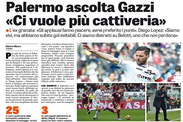 "Per più di un’ora il Palermo ha fatto paura al Toro, accarezzando una vittoria meritata, figlia di un gran gol...