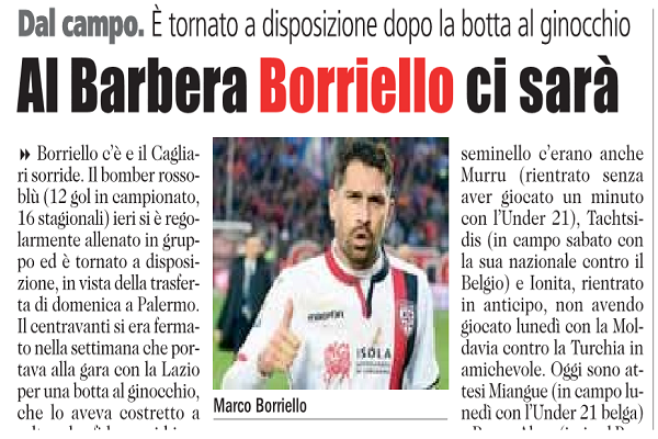 “Borriello c’è e il Cagliari sorride. Il bomber rossoblù (12 gol in campionato, 16 stagionali) ieri si è regolarmente allenato...
