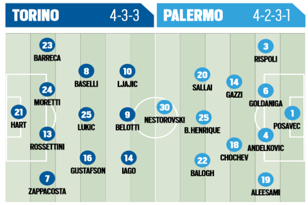 L'edizione odierna di "Tuttosport" ha stilato le probabili formazioni di Torino-Palermo in programma domani alle 15. In alto le potenziali...
