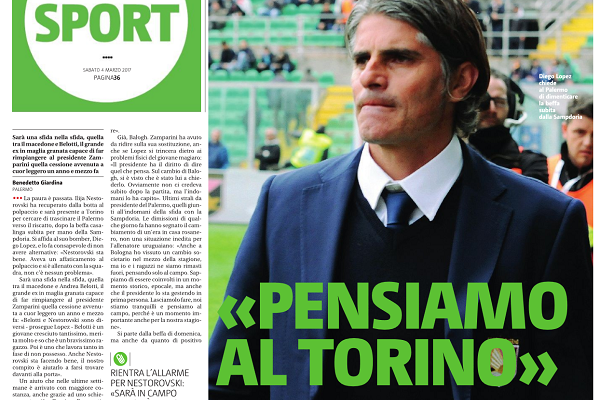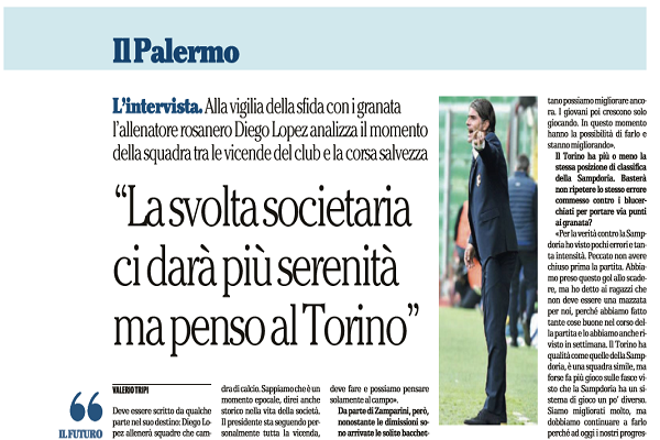 Giornale di Sicilia: “Lopez: «Pensiamo al Torino». All’Olimpico si riparte dal 4-2-3-1 che ha convinto contro la Samp”