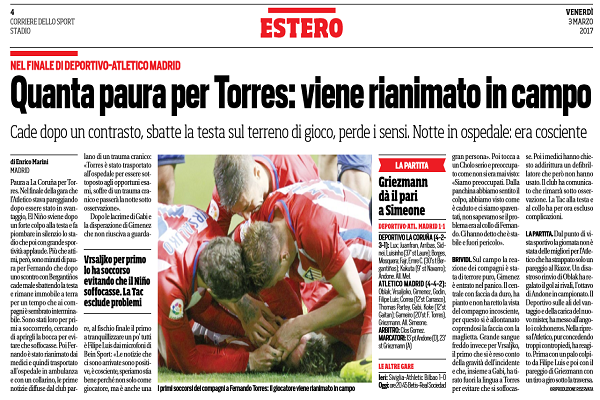 Corriere dello Sport: “Quanta paura per Torres: viene rianimato in campo” (VIDEO)