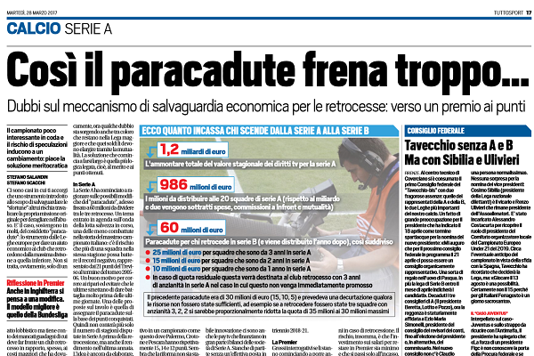 Tuttosport: “Così il paracadute frena troppo. Dubbi sul meccanismo di salvaguardia economica per le retrocesse: verso un premio ai punti”
