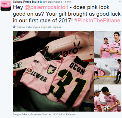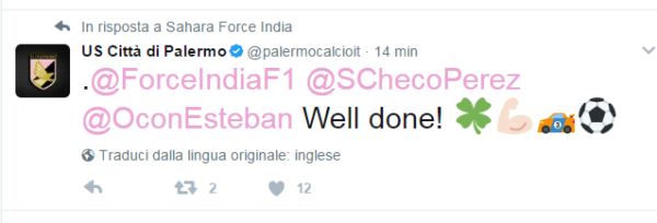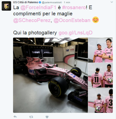 Il Palermo, dopo il Tweet della Force India dove ringrazia per il dono delle maglie rosanero che hanno portato bene...