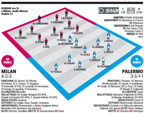 L'edizione odierna de "La Gazzetta dello Sport" ha stilato le probabili formazioni di Milan-Palermo in programma domani alle ore 15....