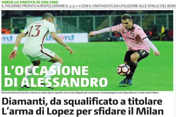 “Da squalificato a titolare. Il «ripescaggio» di Diamanti nell'undici che Lopez ha in mente per la trasferta di “San Siro”...