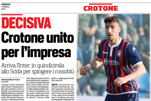 "Crotone ci crede. Domenica arriva l’Inter e vola la prevendita: già esaurite le curve e i distinti, sono rimasti pochi...
