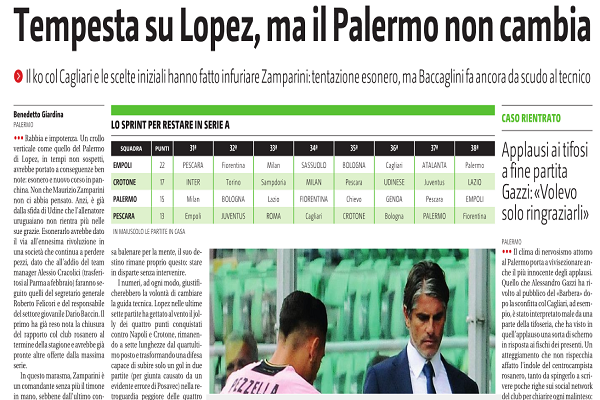 Giornale di Sicilia: “Tempesta su Lopez, ma il Palermo non cambia. Zamparini: tentazione esonero, ma Baccaglini fa ancora scudo”