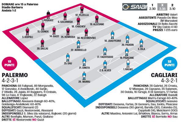 L'edizione odierna de "La Gazzetta dello Sport" ha stilato le probabili formazioni di Palermo-Cagliari. In alto le potenziali scelte dei...