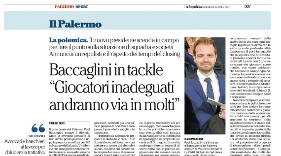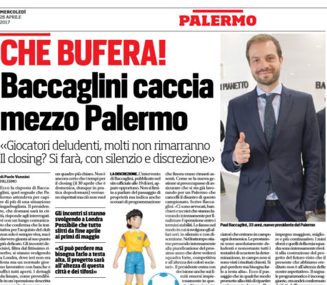 Corriere dello Sport: “Che bufera! Baccaglini caccia mezzo Palermo: «Giocatori deludenti, molti non rimarranno. Il closing? Si farà, con silenzio e discrezione»”