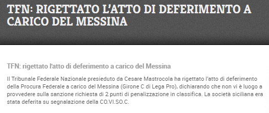 Il Messina ha visto rifiutato dal Tribunale Federale Nazionale il ricorso per i 2 punti di penalizzazione della CO.VI.SO.C ....