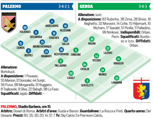 Gazzetta dello Sport: le probabili formazioni di Palermo-Genoa
