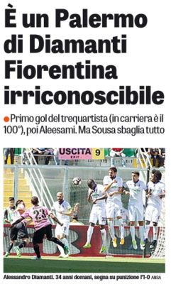 L'edizione odierna de "Il Corriere dello Sport" ha stilato le pagelle di Palermo-Fiorentina, di seguito le valutazioni dei rosanero: "DIAMANTI...