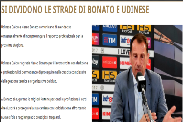 "Udinese Calcio e Nereo Bonato comunicano di aver deciso consensualmente di non prolungare il rapporto professionale per la prossima stagione....