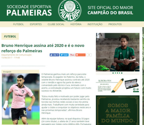 Intervistato dal sito ufficiale del Palmeiras, l'ex centrocampista del Palermo, Bruno Henrique ha parlato del suo passaggio al club brasiliano:...