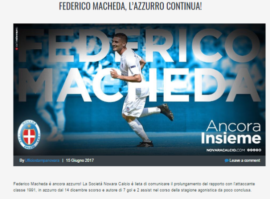Il Novara annuncia tramite il proprio sito ufficiale il rinnovo dell'attaccante Federico Macheda. Di seguito il comunicato apparso sul sito...