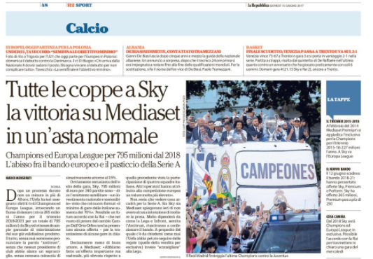 "Dopo un processo durato non un minuto in più di 48 ore, l’Uefa ha ieri assegnato i diritti tv di...