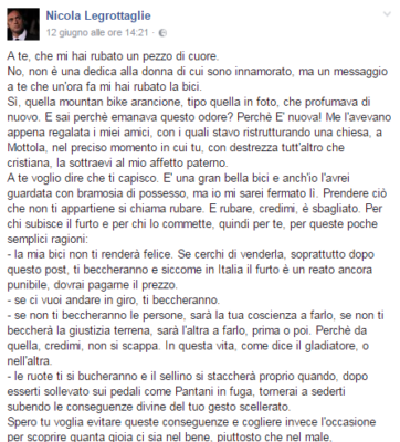Legrottaglie: “Chi mi ha rubato la bicicletta mi ha rubato un pezzo di cuore” (FOTO)