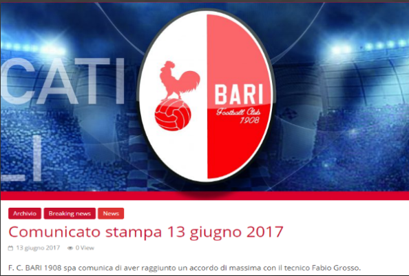 Bari, UFFICIALE: Grosso è il nuovo allenatore – il comunicato