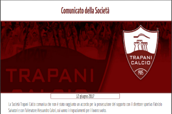 "La Società Trapani Calcio comunica che non è stato raggiunto un accordo per la prosecuzione del rapporto con il direttore...
