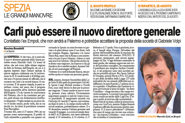 "Il nuovo direttore generale dello Spezia potrebbe essere Marcello Carli. Un uomo di calcio, che nel corso delle ultime stagioni...