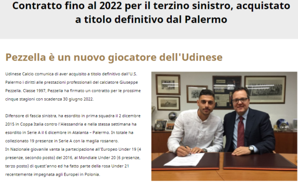 Dopo il comunicato dell'Udinese arriva anche quello del Palermo che comunica di aver ceduto ai friulani il terzino Giuseppe Pezzella....