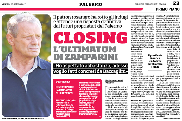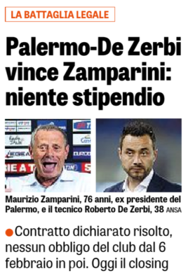 "Alla vigilia del closing Zamparini porta a casa una vittoria. Nella battaglia legale contro Roberto De Zerbi, esonerato il 30...