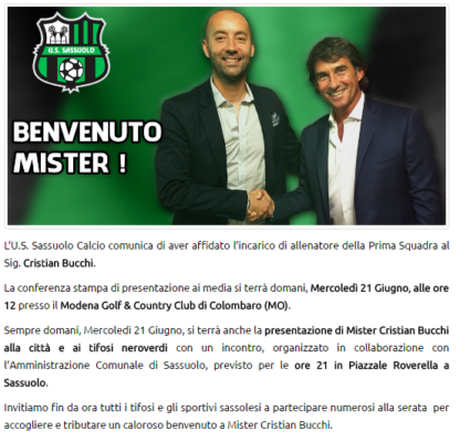 Il Sassuolo Calcio annuncia tramite il proprio sito ufficiale l'arrivo di Cristian Bucchi come allenatore dei neroverdi. Di seguito il...