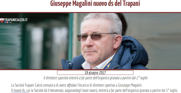 Il Trapani calcio annuncia tramite il proprio sito ufficiale che Giuseppe Magalini sarà il nuovo Ds dei granata. Di seguito...