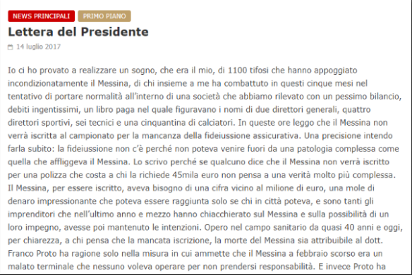 Attraverso un comunicato apparso sul sito ufficiale, il Messina ufficializza la volontà di non iscrivere la squadra al prossimo campionato di Serie...