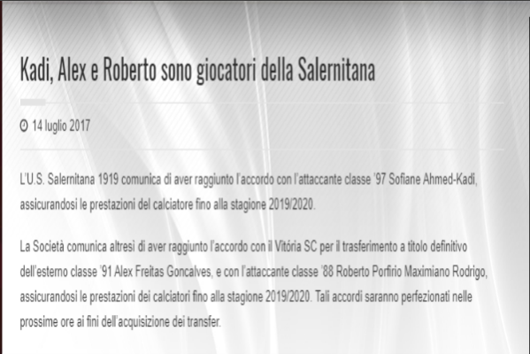 Attraverso una nota sul proprio sito ufficiale, la Salernitana comunica gli acquisti di Sofiane Ahmed-Kadi, Alex Freitas Goncalves e Roberto Porfirio Maximiano Rodrigo....