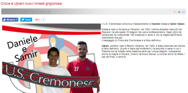 "L'U.S. Cremonese comunica il tesseramento di Daniele Croce e Samir Ujkani. Croce è nato a Giulianova (Teramo), nel 1982. Centrocampista cresciuto nel Pescara, ha...