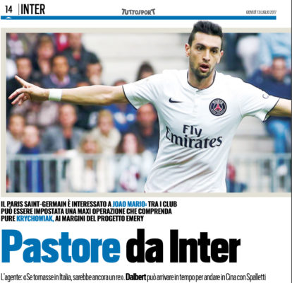 Tuttosport: “Pastore da Inter. L’agente: «Se tornasse in Italia, sarebbe ancora un re»”