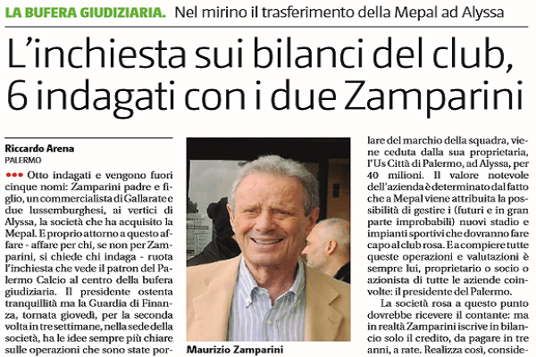 L'edizione odierna de "Il Giornale di Sicilia" fa luce sulla vicenda relativa all'inchiesta che vede coinvolto il Palermo e Maurizio...