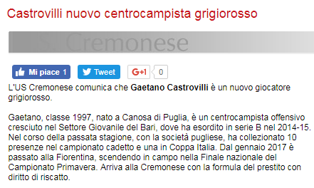 "L'US Cremonese comunica che Gaetano Castrovilli è un nuovo giocatore grigiorosso. Gaetano, classe 1997, nato a Canosa di Puglia, è un centrocampista...