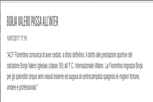 Attraverso una nota sul proprio sito ufficiale, la Fiorentina comunica la cessione di Borja Valero all'Inter. Ecco il comunicato: "ACF Fiorentina...