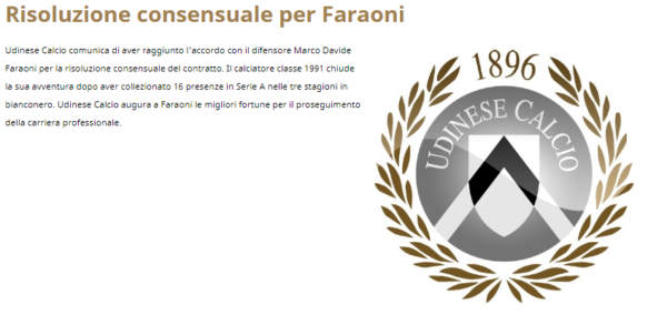 L'Udinese Calcio, annuncia tramite il proprio sito ufficiale, di aver rescisso il contratto con il difensore Marco Faraoni. Di seguito...
