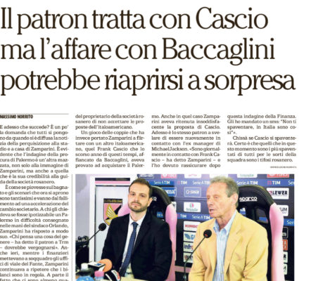Repubblica: “Gli scenari che si aprono per il club sono i più svariati. Il patron tratta con Cascio, ma l’affare con Baccaglini potrebbe riaprirsi a sorpresa”