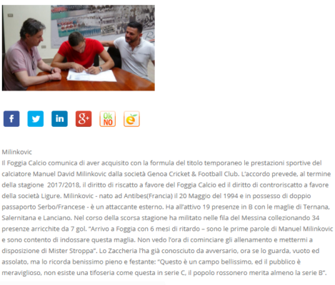 Il Foggia, tramite il proprio sito ufficiale, annuncia di aver prelevato dal Genoa le prestazioni del centrocampista Manuel David Milinkovic....