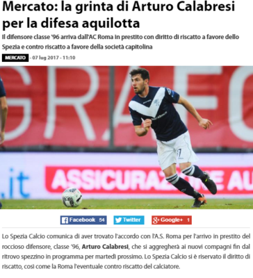 "Lo Spezia Calcio comunica di aver trovato l'accordo con l'A.S. Roma per l'arrivo in prestito del roccioso difensore, classe ’96, Arturo Calabresi, che...
