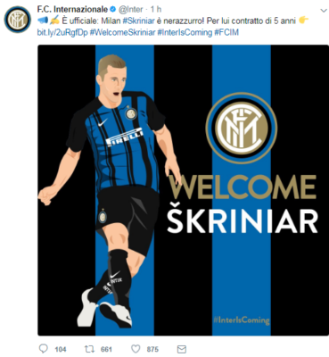 L'Inter, tramite il proprio profilo Twitter annuncia l'arrivo del difensore Milan Skriniar dalla Sampdoria. Di seguito il tweet del club:...