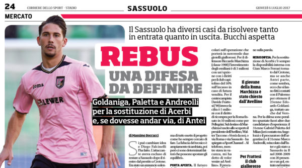 Corriere dello Sport: “Sassuolo, contatti con il Palermo per Goldaniga. Le alternative…”
