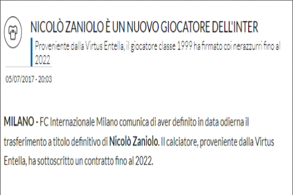 Attraverso una nota sul proprio sito ufficiale, l'Inter annuncia l'acquisto di Nicolò Zaniolo dalla Virtus Entella. Ecco il comunicato: "FC...