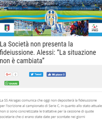 La partecipazione dell'Akragas al prossimo campionato di serie C è a rischio. Il club agrigentino con un comunicato apparso sul...