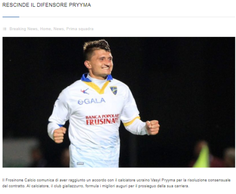 Il Frosinone, tramite il proprio sito ufficiale, annuncia di aver rescisso il contratto con il difensore classe '91 Vasyl Pryyma. Di...